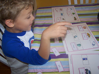 The activity on the right is from Pink Beginning Sound Cards from Montessori Print Shop. I laminated the sheet so he could write in dry erase marker on the card.